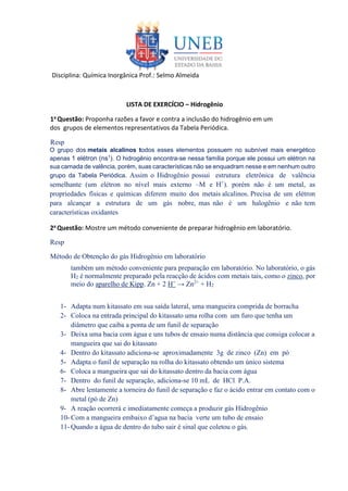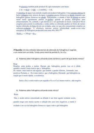 O documento discute as propriedades do hidrogênio e sua obtenção em laboratório. Apresenta uma lista de exercícios sobre hidrogênio com questões sobre sua classificação na tabela periódica, métodos de preparação em laboratório, propriedades e aplicações.