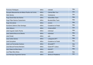 Este documento lista os participantes de uma prova ciclística, incluindo o seu nome completo, distância a percorrer, equipa e se está confirmado ou não. São listados um total de 88 participantes com diferentes distâncias e equipas, sendo que a maioria ainda não está confirmada.