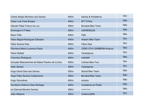1) A lista apresenta os participantes de uma prova ciclística com as respetivas distâncias, equipas e confirmação de participação.