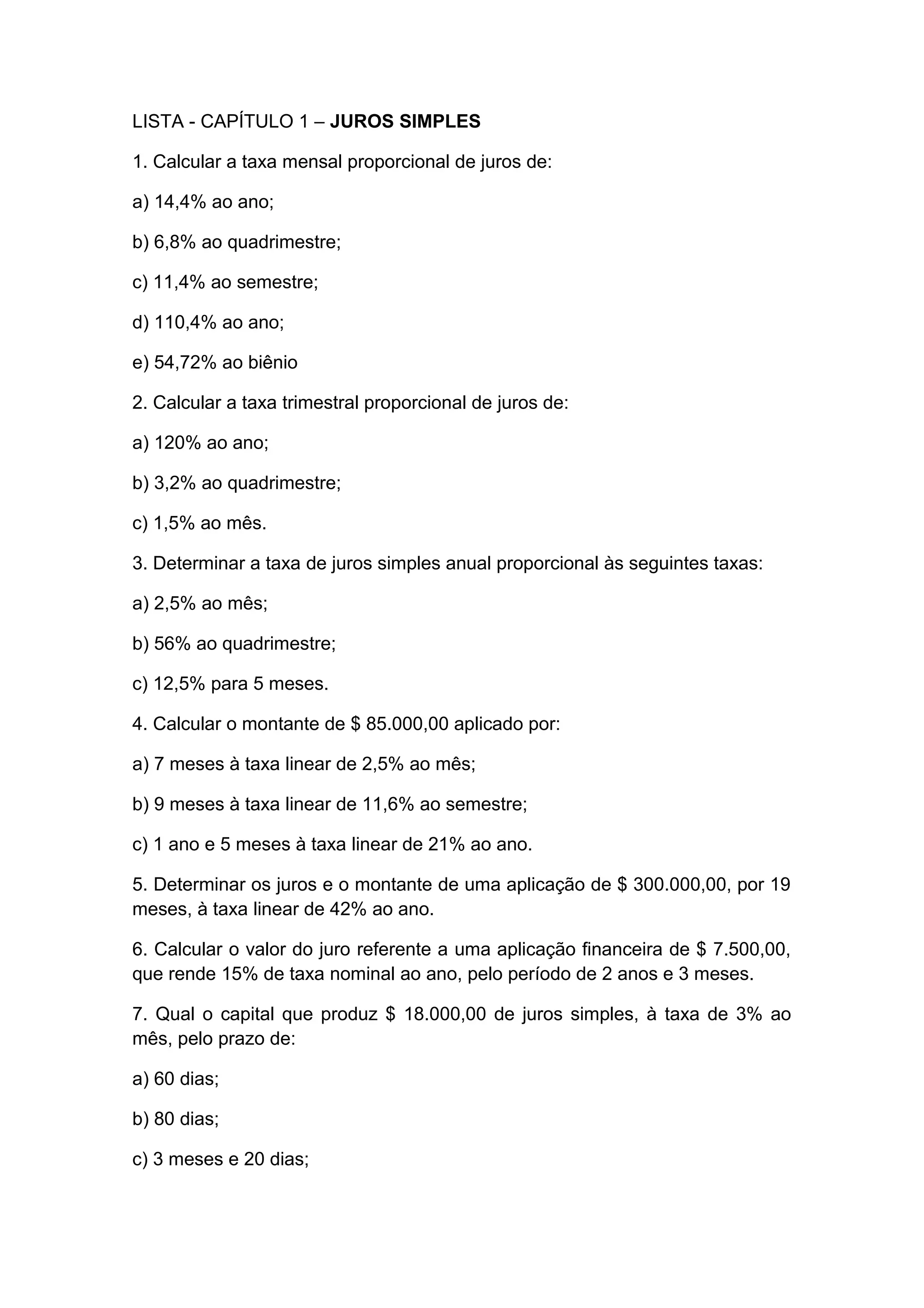 O documento lista vários exercícios sobre juros simples, incluindo calcular taxas de juros, montantes, valores de juros e capitais para diferentes prazos e taxas.