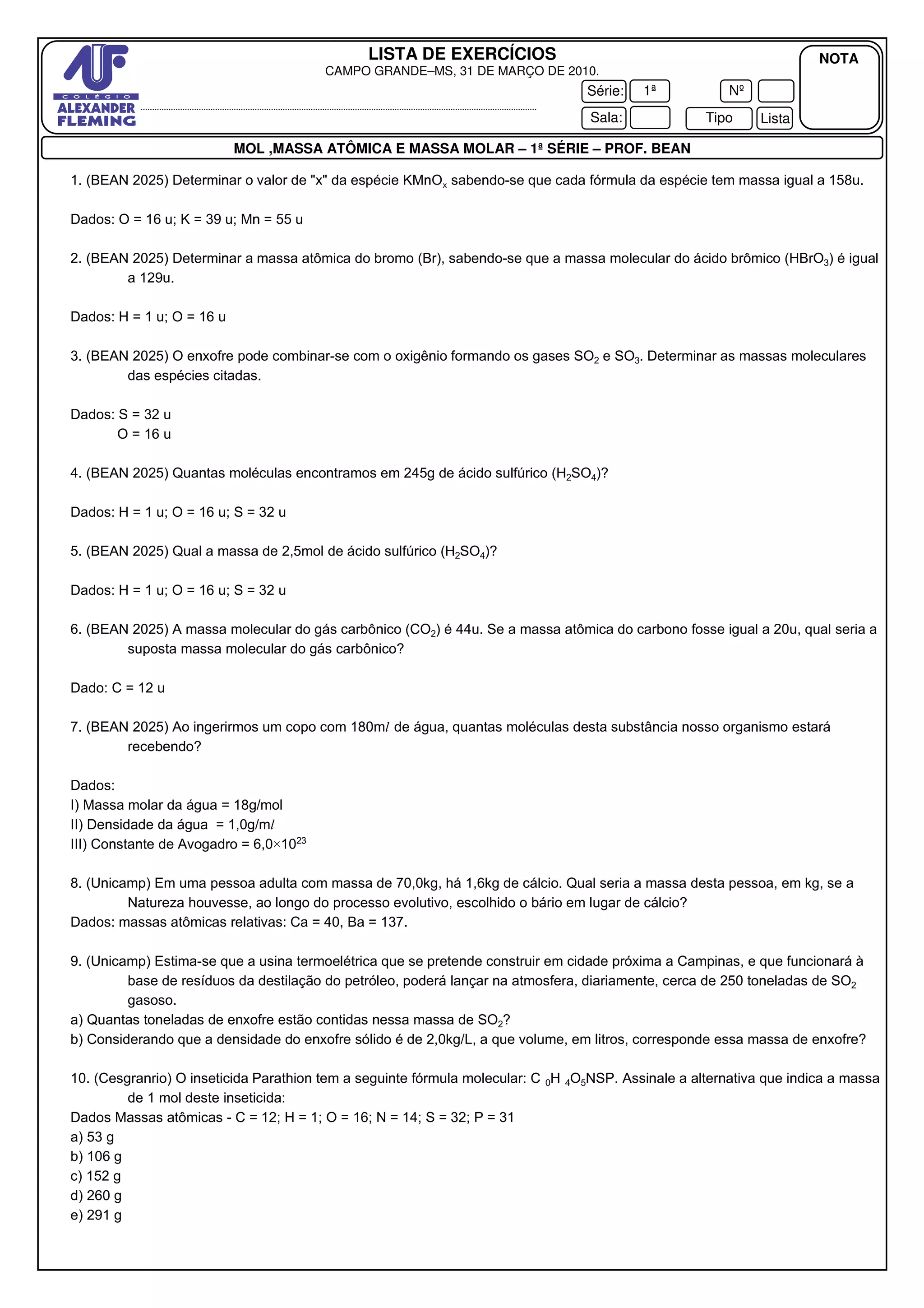 1. O documento apresenta 20 questões sobre cálculos envolvendo massa atômica, massa molecular e quantidade de substância. As questões abordam tópicos como determinação de massas atômicas e molares, cálculo de moléculas e mols em diferentes quantidades de substâncias e comparação entre diferentes elementos químicos.