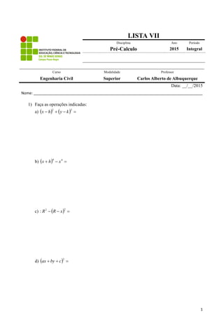 1. O documento é uma lista de exercícios de pré-cálculo contendo operações algébricas como adição, subtração, multiplicação e fatoração de expressões polinomiais.