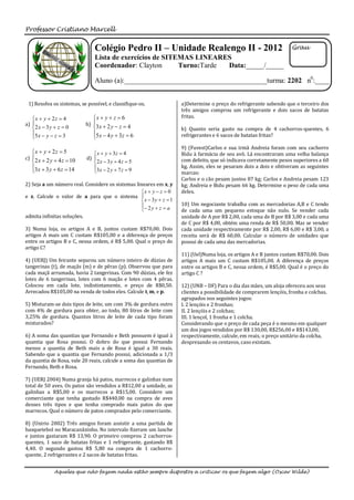 Este documento apresenta uma lista de exercícios de sistemas lineares com 12 questões. As questões abordam tópicos como resolução de sistemas lineares, cálculo de preços de produtos com base em sistemas de equações e problemas envolvendo misturas de produtos.
