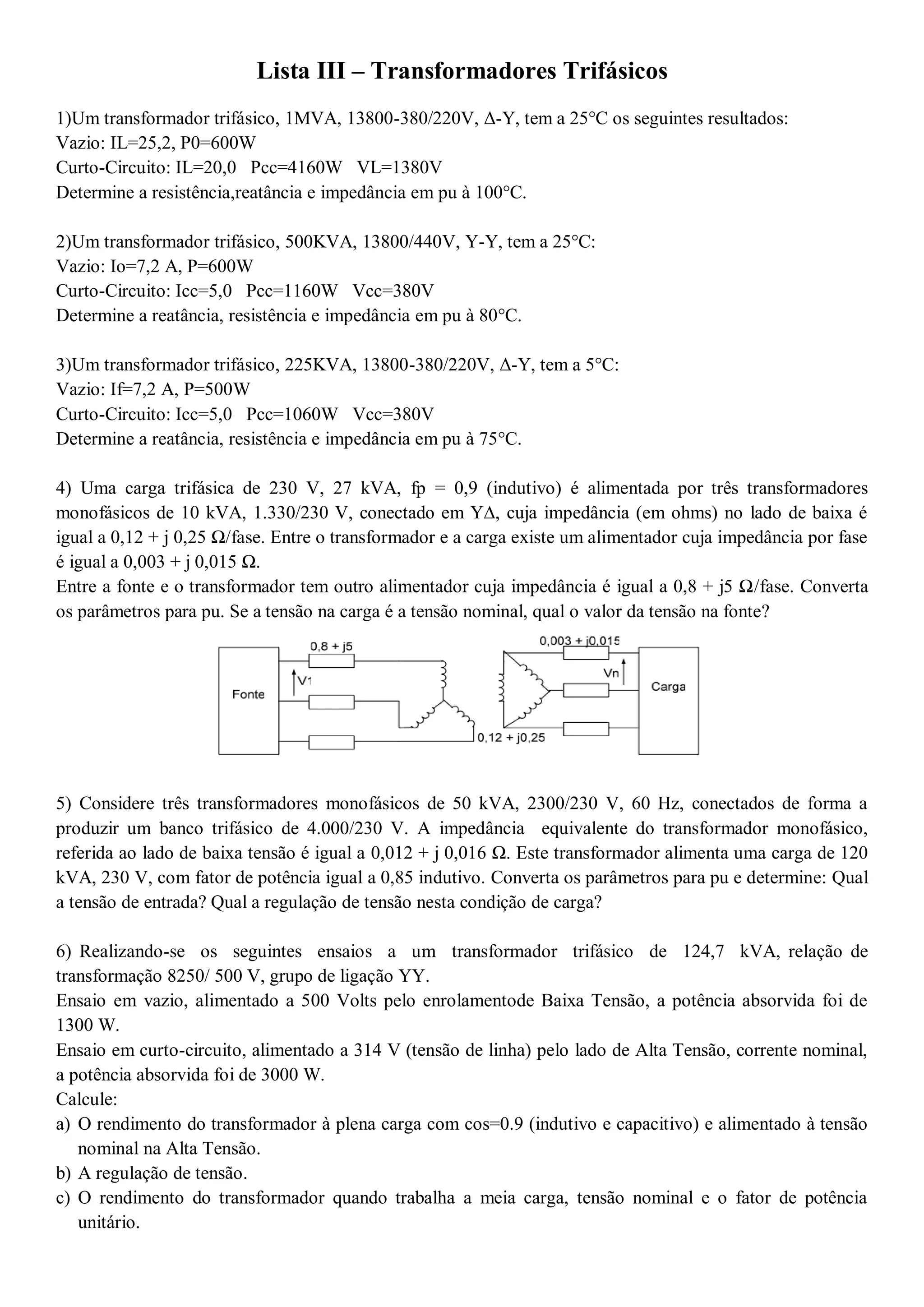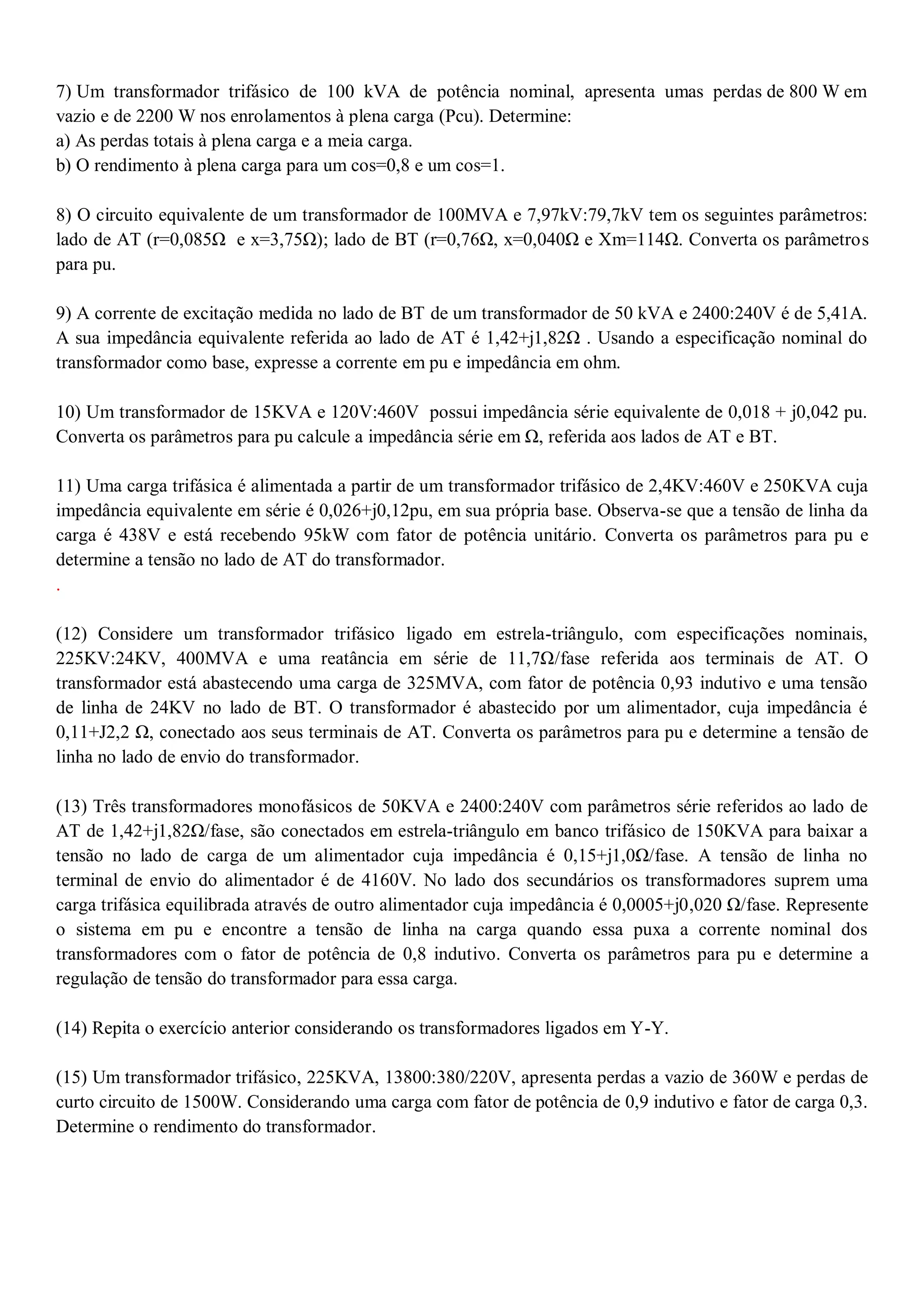 1) O documento apresenta 15 exercícios sobre transformadores trifásicos. Os exercícios pedem para calcular parâmetros como resistência, reatância, impedância e rendimento dos transformadores, bem como tensões e correntes, a partir de dados técnicos fornecidos sobre os transformadores e suas cargas.