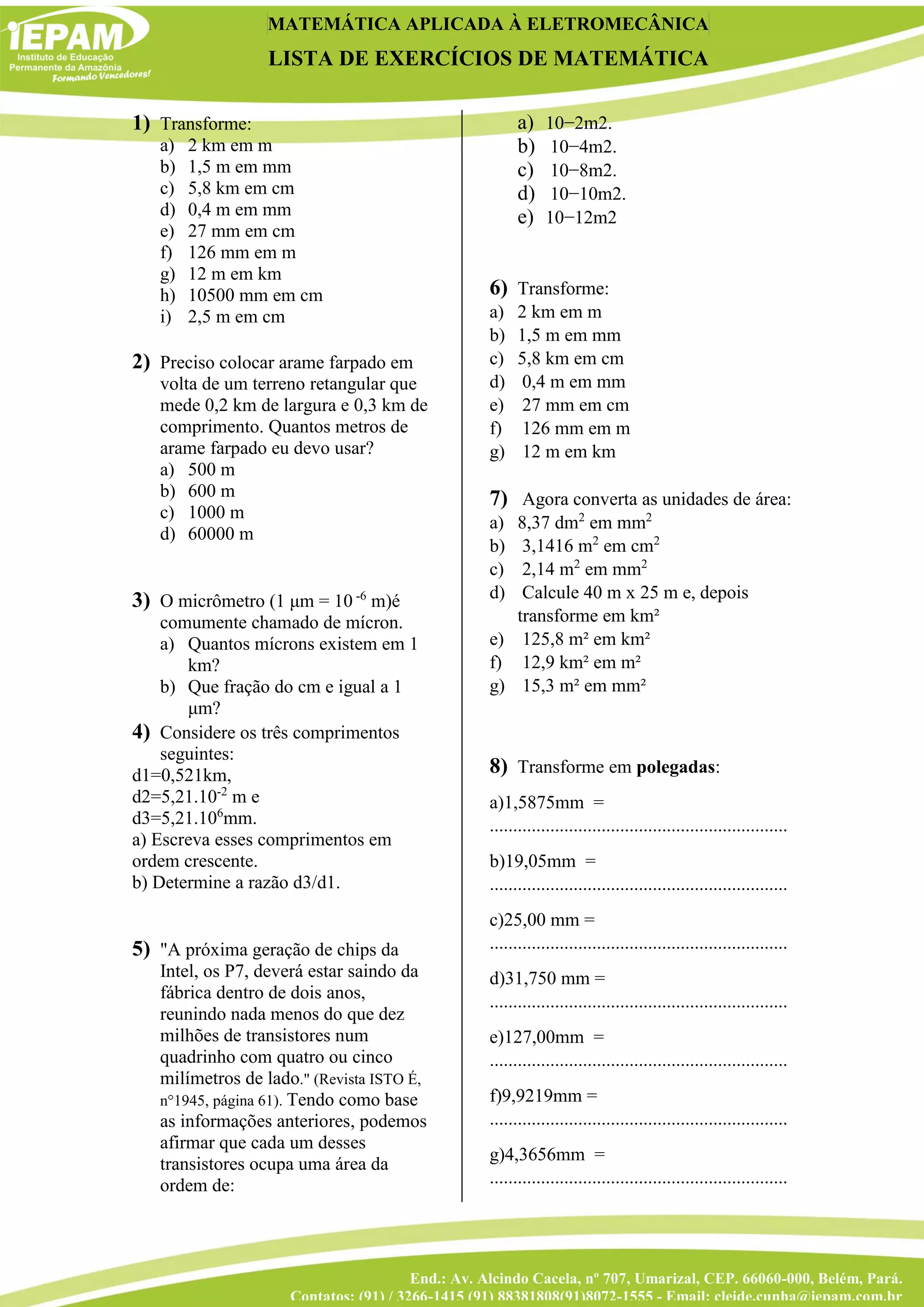 O documento contém uma lista de exercícios de matemática aplicada à eletromecânica com várias questões que envolvem conversões de unidades de comprimento e área entre metros, centímetros, milímetros, quilômetros e polegadas.