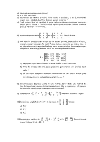 3) Algumas questões abordam interpretação e análise de dados apresentados em matrizes no contexto de sistemas de transporte, comunicação e vendas.