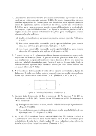 Este documento apresenta 14 exercícios de probabilidade para engenharia que envolvem circuitos elétricos, produção industrial, transporte aéreo e fabricação de semicondutores. Os exercícios calculam probabilidades de eventos como falha em equipamentos, aprovação de projetos, disponibilidade de serviços e qualidade de processos produtivos.