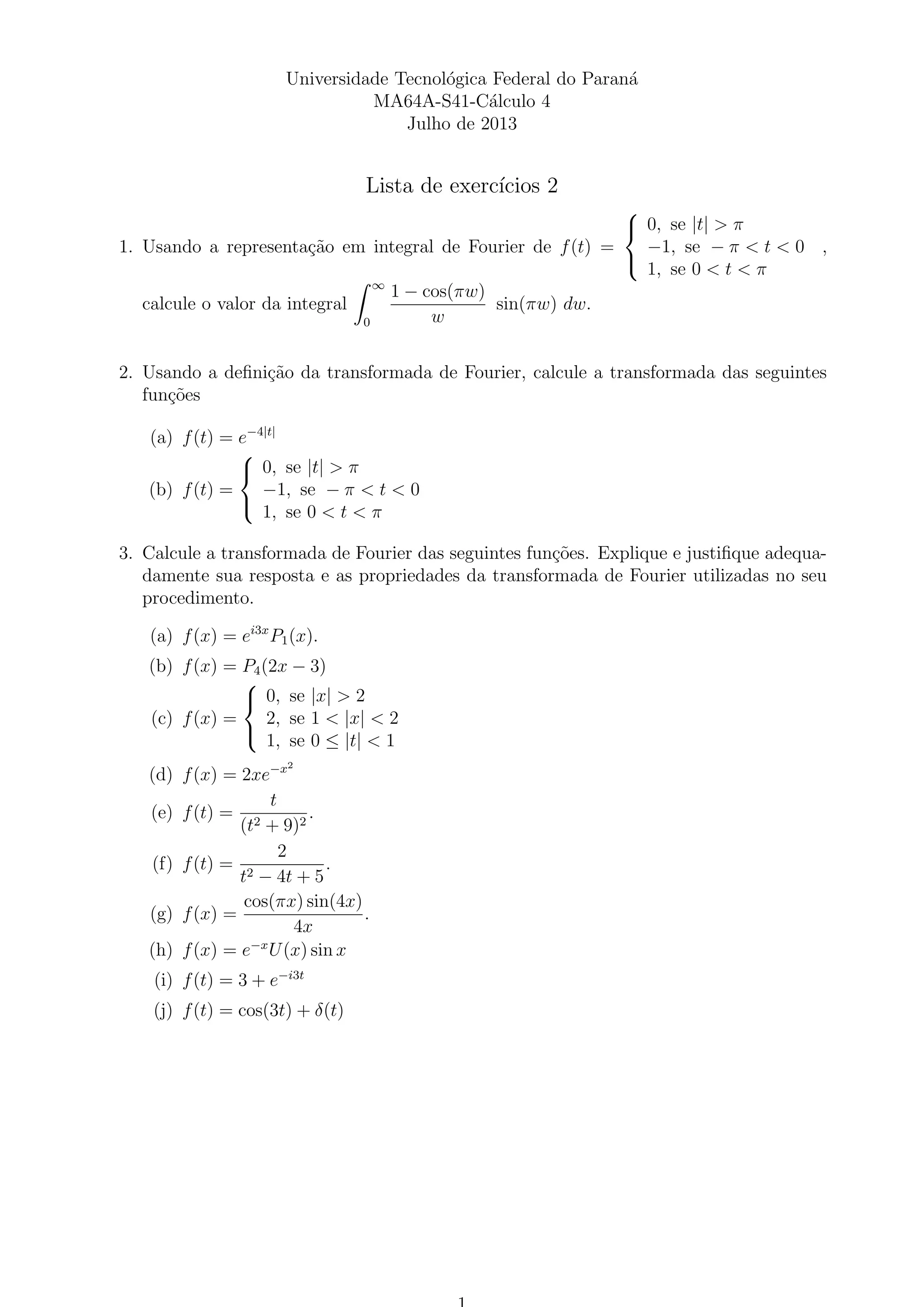 O documento apresenta uma lista de exercícios sobre cálculo e transformada de Fourier. Inclui exercícios para calcular valores de integrais usando a representação de Fourier, calcular transformadas de Fourier de diferentes funções, integrar funções, determinar expressões para a convolução de funções e identificar propriedades da transformada de Fourier a partir de informações sobre a função original.