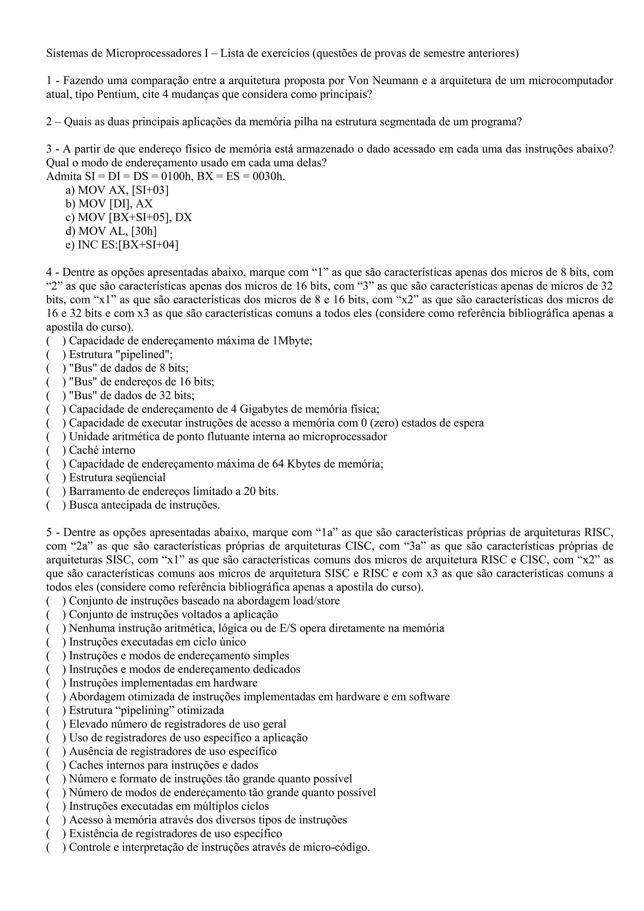 O documento apresenta 5 questões sobre sistemas de microprocessadores. A questão 1 pede para comparar as arquiteturas de Von Neumann e Pentium, citando 4 mudanças principais. A questão 2 pergunta sobre as aplicações da memória pilha em programas segmentados. A questão 3 apresenta instruções para analisar endereçamentos e modos de endereçamento. A questão 4 pede para marcar características de micros de 8, 16 e 32 bits. A questão 5 pede para marcar características de arquiteturas RISC, CISC e SISC.