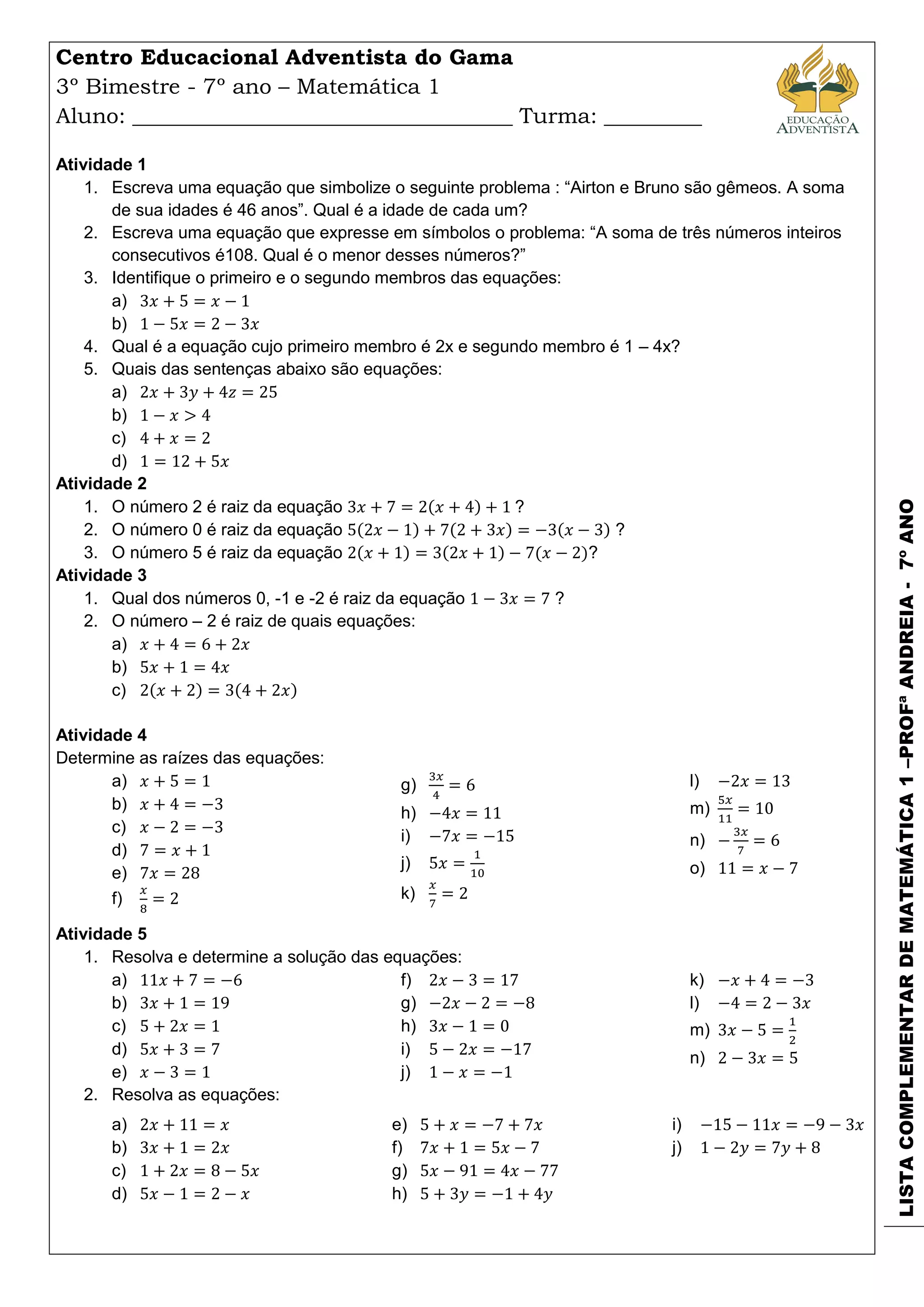 O documento contém 5 atividades de matemática sobre equações do 7o ano. A primeira atividade pede para escrever equações simbolizando problemas verbais. A segunda atividade avalia se determinados números são raízes de equações. A terceira atividade pede para identificar quais números são raízes de equações. A quarta atividade pede para determinar as raízes de várias equações. A quinta atividade pede para resolver e determinar a solução de várias equações.