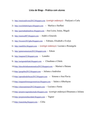 Este documento lista 17 blogs criados por alunos com seus respectivos nomes e endereços. Os blogs abordam diversos temas educacionais como música, ciclo hidrológico, guerra do planalto, lixo zero, origem do funk, frações e geometria.