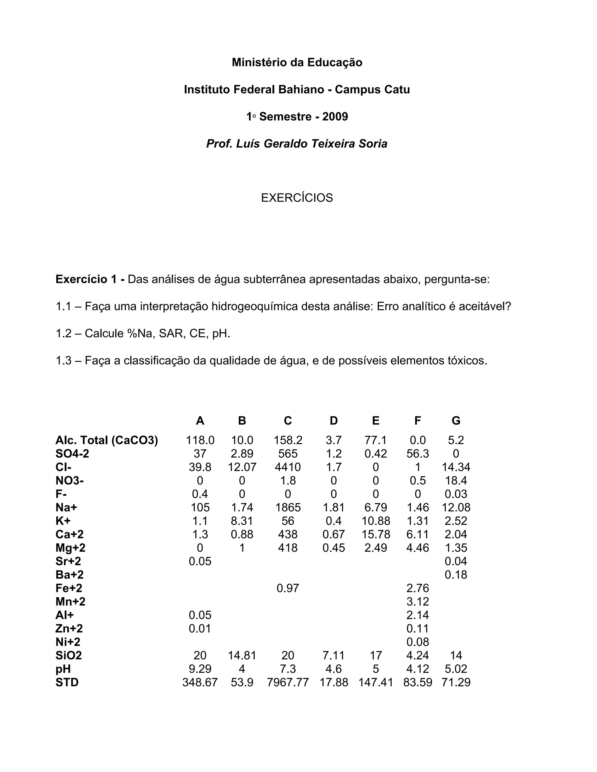 1) O documento apresenta quatro exercícios de interpretação hidrogeoquímica de amostras de água subterrânea. Fornece tabelas com análises químicas de poços e rios, incluindo concentrações de íons e parâmetros como pH e temperatura.