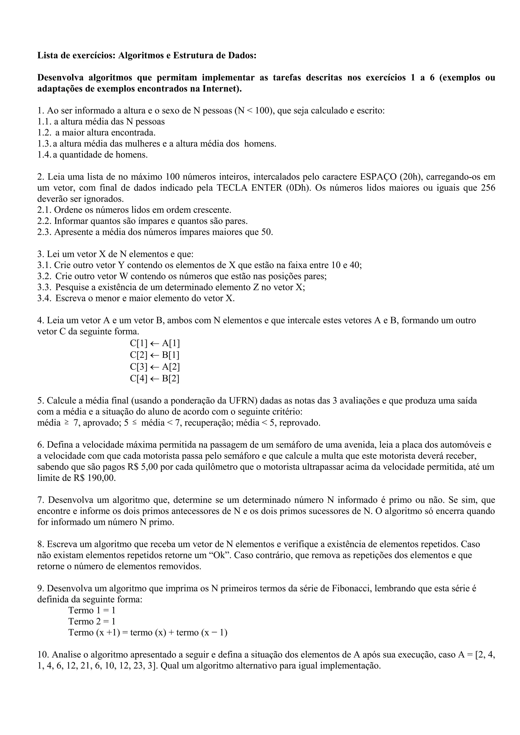 2. Os exercícios pedem para desenvolver algoritmos que resolvam tarefas como ler e processar dados de altura e sexo de pessoas, ordenar e analisar números em vetores, intercalar vetores, calcular média final de notas com critérios, calcular multa de trânsito baseada em velocidade e outros.