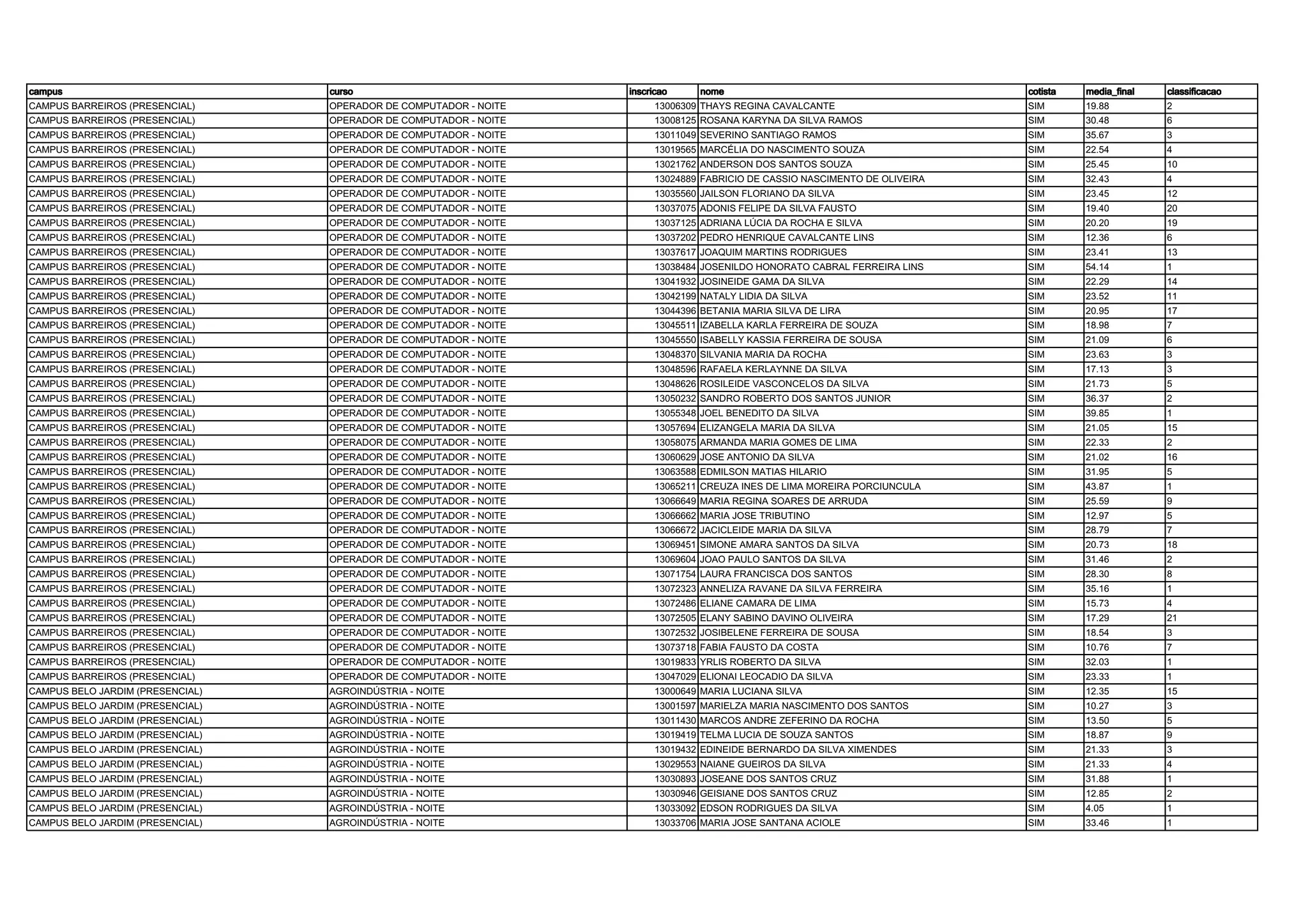 Este documento lista os alunos matriculados nos cursos de Operador de Computador no período noturno no campus Barreiros e de Agroindústria no período noturno no campus Belo Jardim, contendo informações sobre o campus, curso, matrícula, nome, cota, média final e classificação.