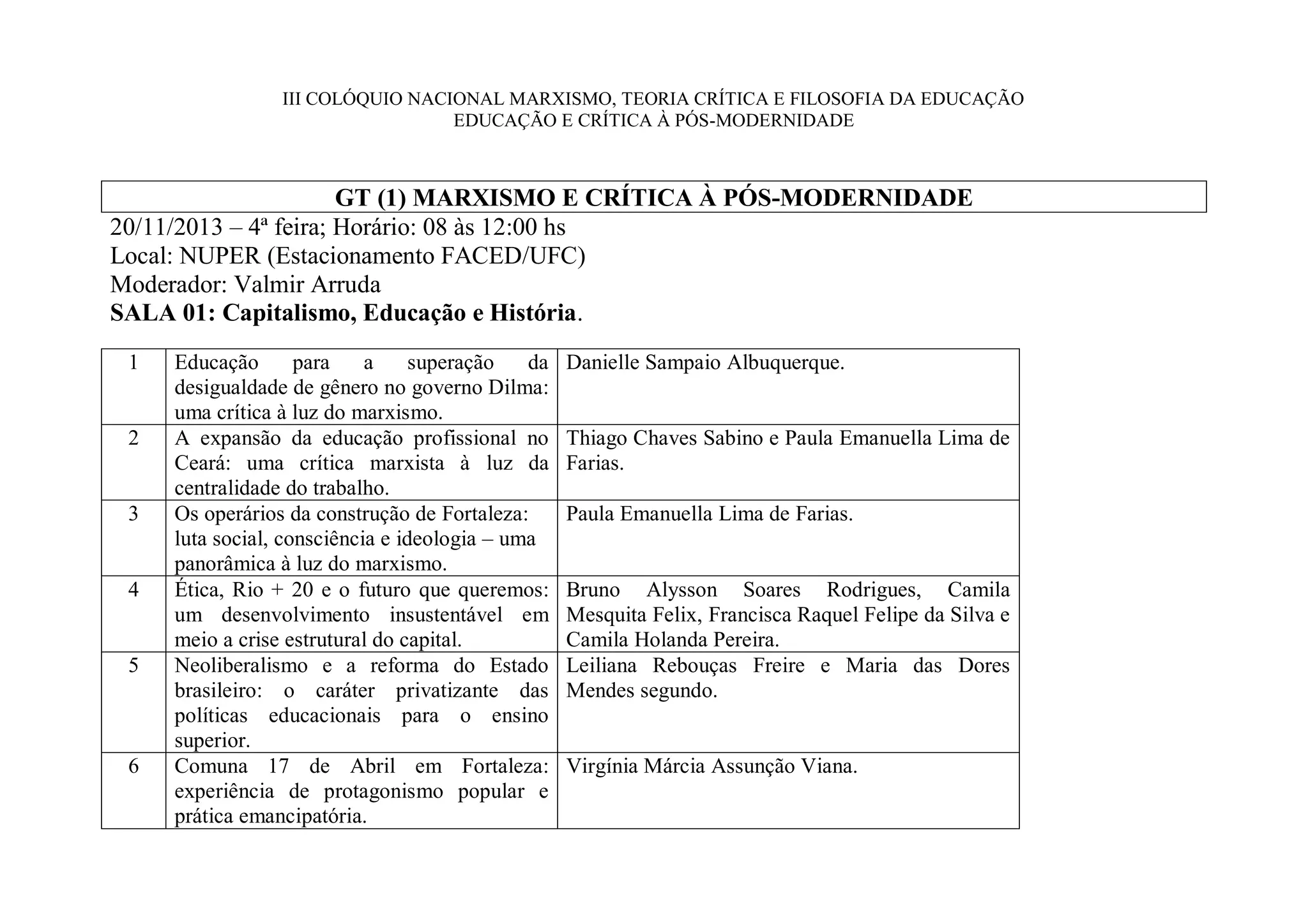 Este documento descreve o programa do III Colóquio Nacional Marxismo, Teoria Crítica e Filosofia da Educação, que ocorreu entre os dias 20 e 22 de novembro de 2013. O colóquio incluiu dez grupos de trabalho que debateram temas como marxismo e crítica à pós-modernidade, filosofia da educação, teoria crítica, arte e cultura. Cada grupo de trabalho reuniu entre 6 a 9 apresentações acadêmicas sobre os respectivos temas.