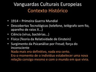 O documento discute as vanguardas culturais européias no início do século XX, descrevendo movimentos como Cubismo, Futurismo, Expressionismo, Dadaísmo e Surrealismo. Esses movimentos surgiram após a Primeira Guerra Mundial e objetivavam quebrar com a arte do século XIX, encontrando novas formas de expressão que refletissem a modernidade.