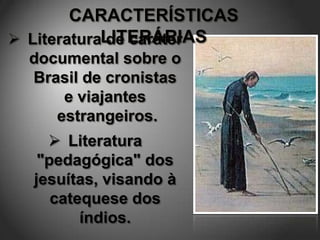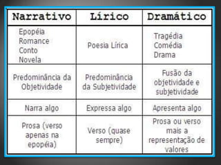 O documento discute diferentes gêneros literários e suas características. Aborda a literatura do século XVI no Brasil, o período barroco no Brasil e suas principais características como a arte da contrarreforma, o tema da passagem do tempo e a forma tumultuosa. Também descreve figuras de linguagem como a metáfora, antítese, paradoxo e hipérbole usadas na literatura barroca.