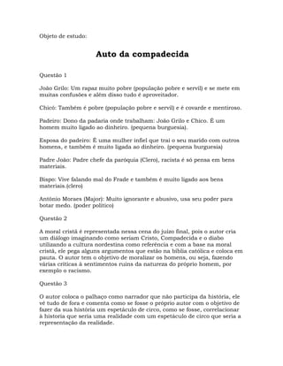 Este documento resume o Auto da Compadecida, obra literária de Ariano Suassuna. Resume os principais personagens como João Grilo e Chicó, representantes da população pobre, e o Padeiro e sua esposa, representantes da pequena burguesia. Discute a representação da moral cristã na obra e o uso do palhaço como narrador para correlacionar a história com um espetáculo de circo.