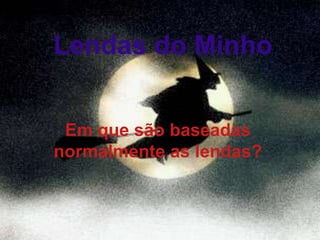 Este documento contém três lendas e provérbios populares da região do Minho em Portugal. A lenda de Viana explica como a cidade recebeu seu nome, a lenda de Barcelos descreve um milagre ocorrido com um galo, e a lenda do pé de cabra envolve o diabo. Os provérbios do Minho geralmente usam personificações ou têm significados explícitos que podem ser aplicados a diferentes situações. Exemplos incluem "Tal pai, tal filho" e "Grão a grão enche a galinha