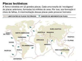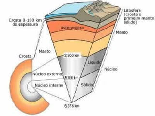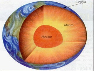A Terra é composta por crosta terrestre, manto e núcleo. A crosta é a camada mais externa onde vivem os seres vivos, sendo mais espessa nos continentes. O manto, abaixo da crosta, é formado por rochas a altas pressões e temperaturas. O núcleo é dividido em externo, líquido, e interno, sólido.