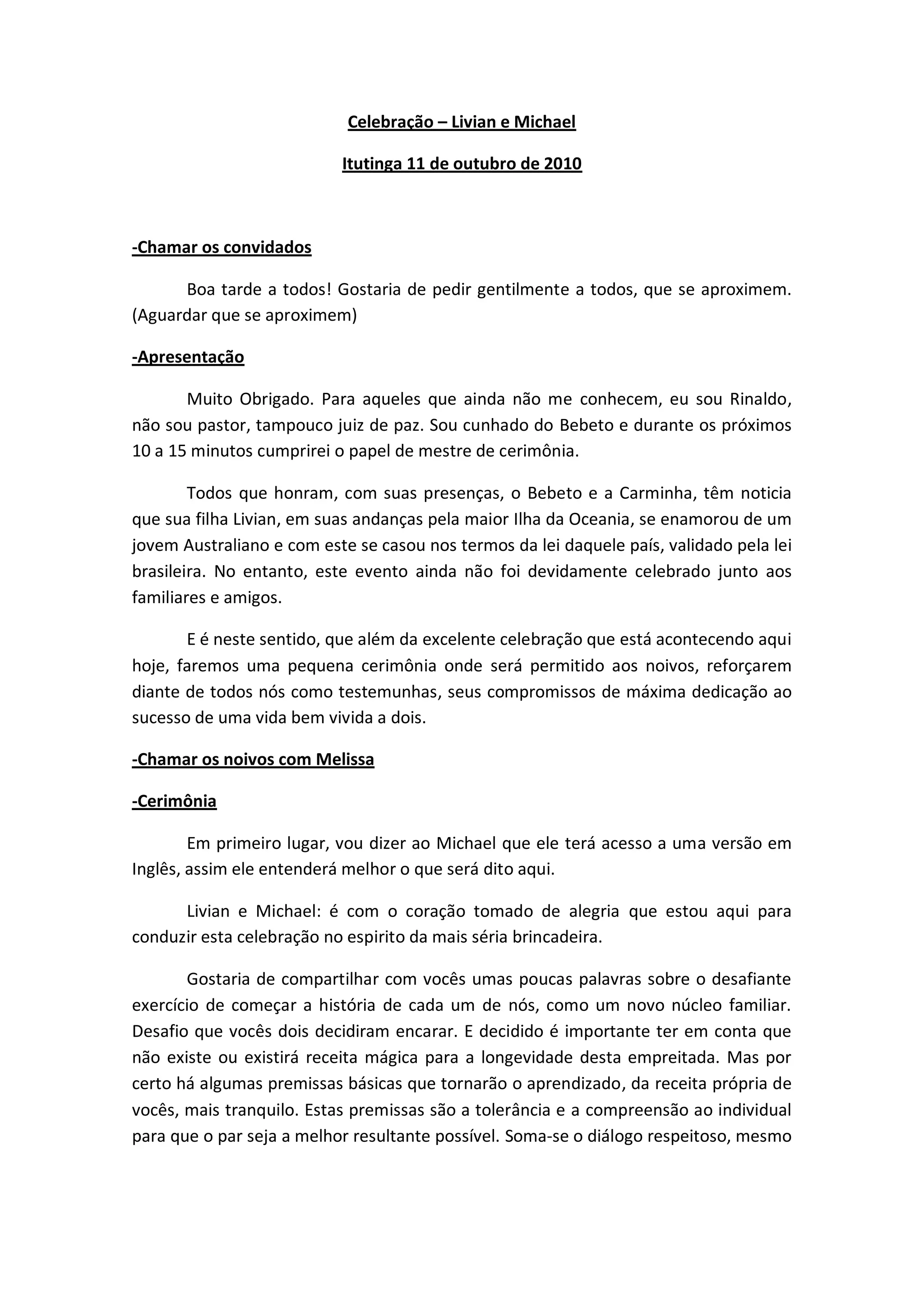 Este documento descreve uma pequena cerimônia de casamento para Livian e Michael na presença de familiares e amigos no Brasil, após terem se casado na Austrália. O mestre de cerimônias conduz breves discursos celebrando o casal e enfatizando a importância da tolerância, compreensão e diálogo para o sucesso do relacionamento deles. Em seguida, Livian e Michael reforçam publicamente seus votos de compromisso um com o outro diante dos presentes.