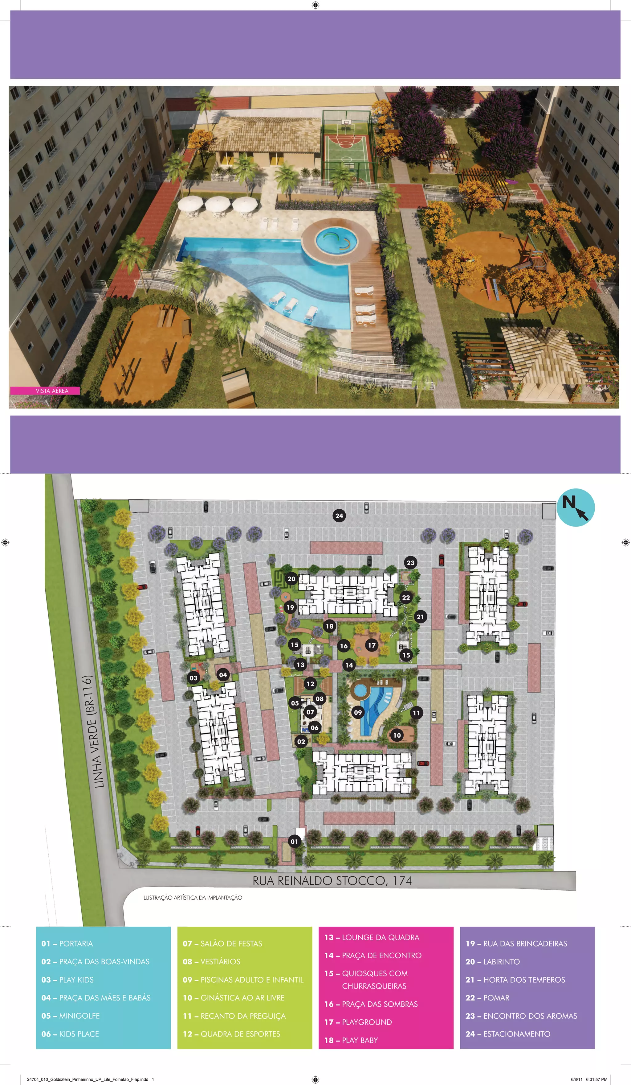 O documento apresenta o plano de implantação de um empreendimento residencial com diversas áreas de lazer e convivência familiar numeradas de 01 a 24. Entre as áreas destacam-se piscinas, quadra esportiva, playground, horta, pomar, quiosques com churrasqueira e estacionamento. O texto também descreve que o local terá espaços projetados para proporcionar momentos inesquecíveis para as famílias.