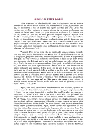 O documento discute temas centrais do cristianismo, como a misericórdia de Deus, a salvação através da fé em Jesus Cristo e a importância do arrependimento. Destaca a justificativa e a redenção oferecidas por meio do sacrifício de Cristo, ressaltando a necessidade de viver de acordo com os ensinamentos divinos. Por fim, enfatiza a certeza da vida eterna para aqueles que creem em Jesus e o juízo inevitável sobre os que rejeitam essa verdade.