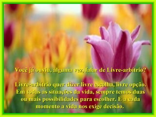 O documento discute o livre-arbítrio e como as pessoas têm a liberdade de escolha em todas as situações da vida, desde pequenas decisões diárias até como reagir a ofensas. Nossas escolhas determinam nossas ações e consequências, de acordo com a lei de causa e efeito. Somos responsáveis pelos resultados de nossas próprias decisões e ações.