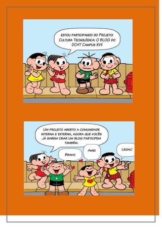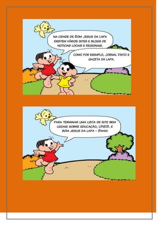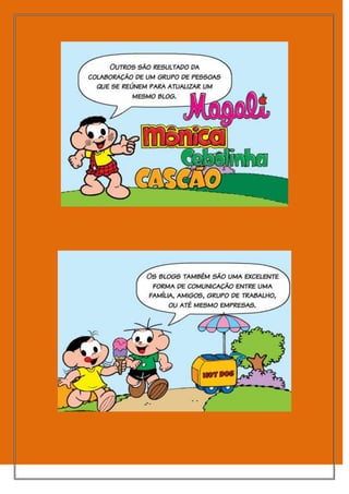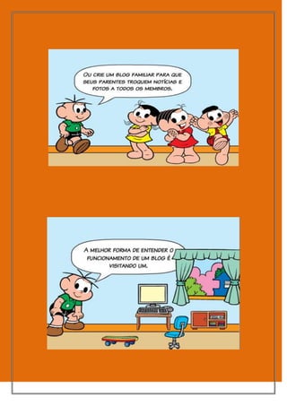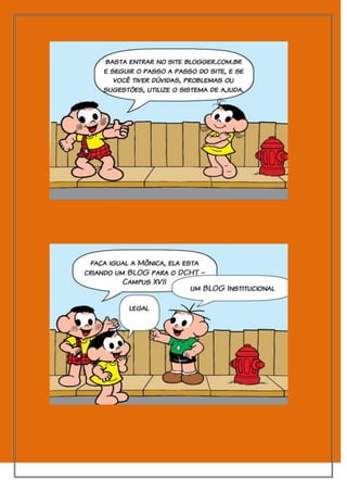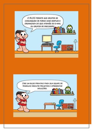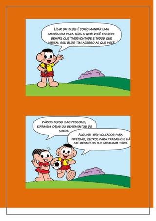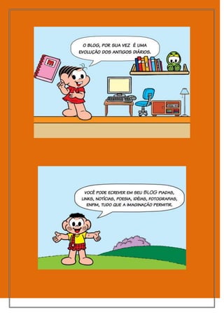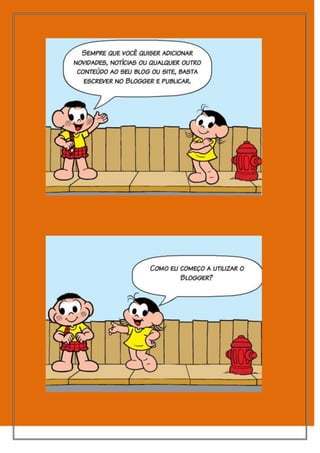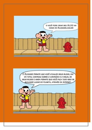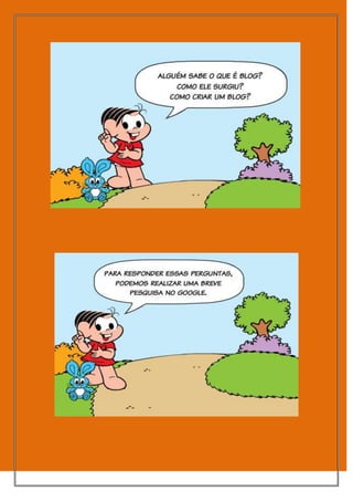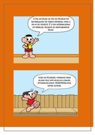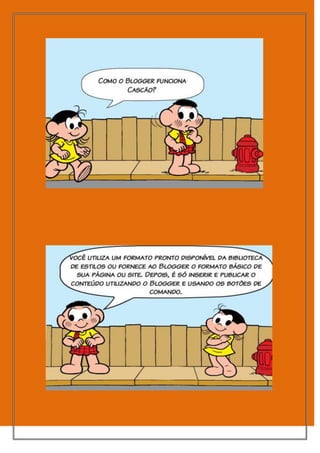 1) O documento discute o uso de blogs na educação e fornece exemplos de como blogs podem ser usados pedagogicamente. 2) Inclui instruções sobre como criar um blog no Blogger, incluindo escolher um título, modelo e configurações básicas. 3) Fornece dicas para ser um bom blogueiro, como escrever com qualidade, buscar feedback e se manter informado sobre o assunto do blog.