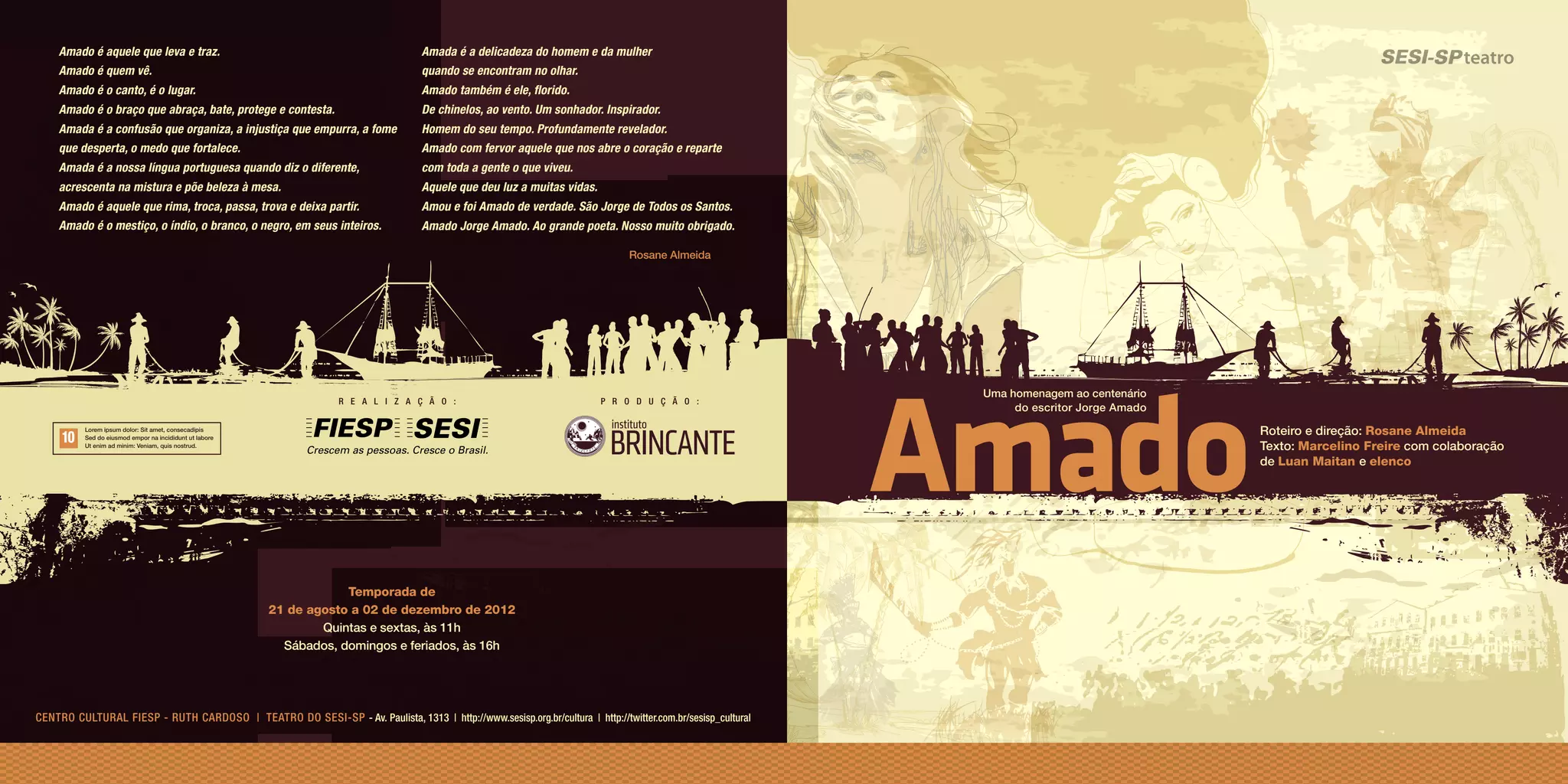 Este documento descreve um espetáculo teatral produzido pelo Instituto Brincante em homenagem ao centenário do escritor brasileiro Jorge Amado. O espetáculo usa diversas linguagens artísticas populares como música, dança e teatro para retratar personagens e histórias de vários livros de Amado. Ele tem como objetivo celebrar a obra de Amado e a cultura popular brasileira que ele retratou.