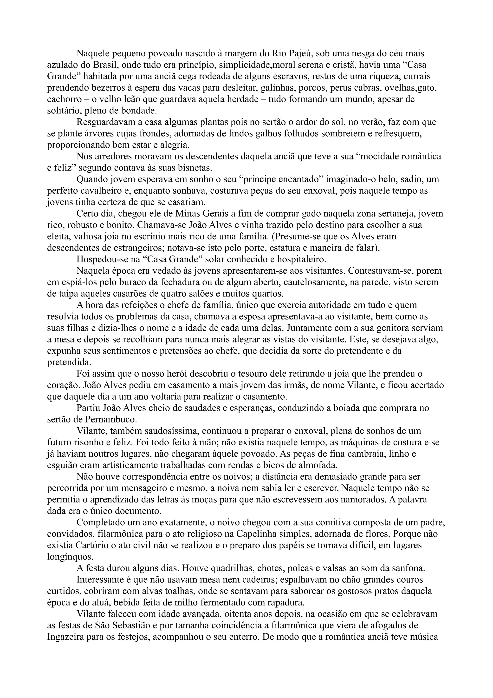 O documento descreve a história de amor entre Vilante e João Alves no século XIX em um pequeno povoado no sertão de Pernambuco. João Alves chegou de Minas Gerais para comprar gado e se hospedou na Casa Grande, onde conheceu e pediu em casamento Vilante. Um ano depois, ele retornou para o casamento com uma comitiva e festejos que duraram vários dias na capelinha local.