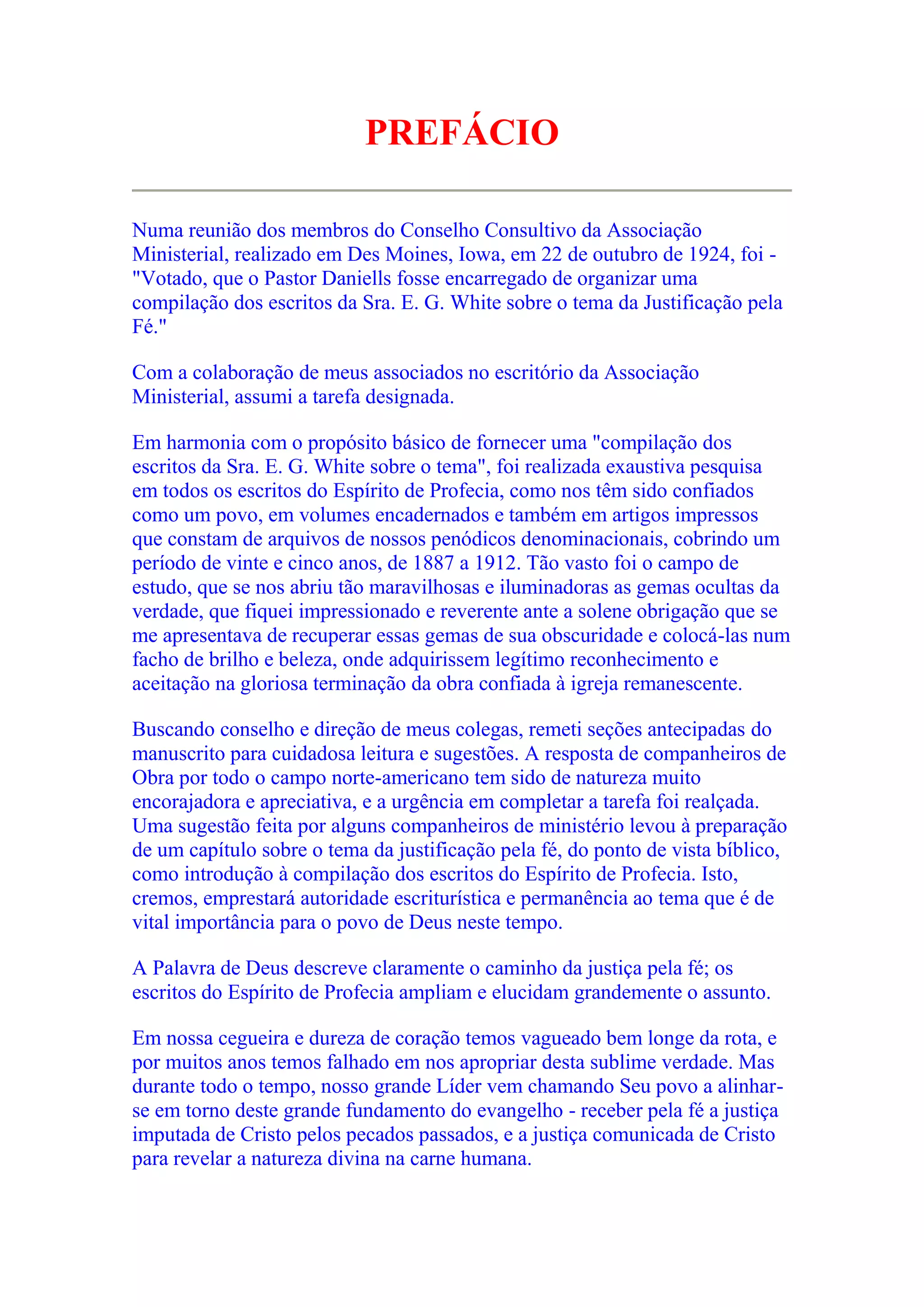 O documento apresenta um resumo de um livro sobre a justificação pela fé compilado a partir dos escritos de E.G. White. Ele descreve a tarefa de compilar os escritos sobre esse tema, a importância da mensagem de justificação pela fé e como ela é apresentada nas Escrituras e nos escritos de E.G. White.