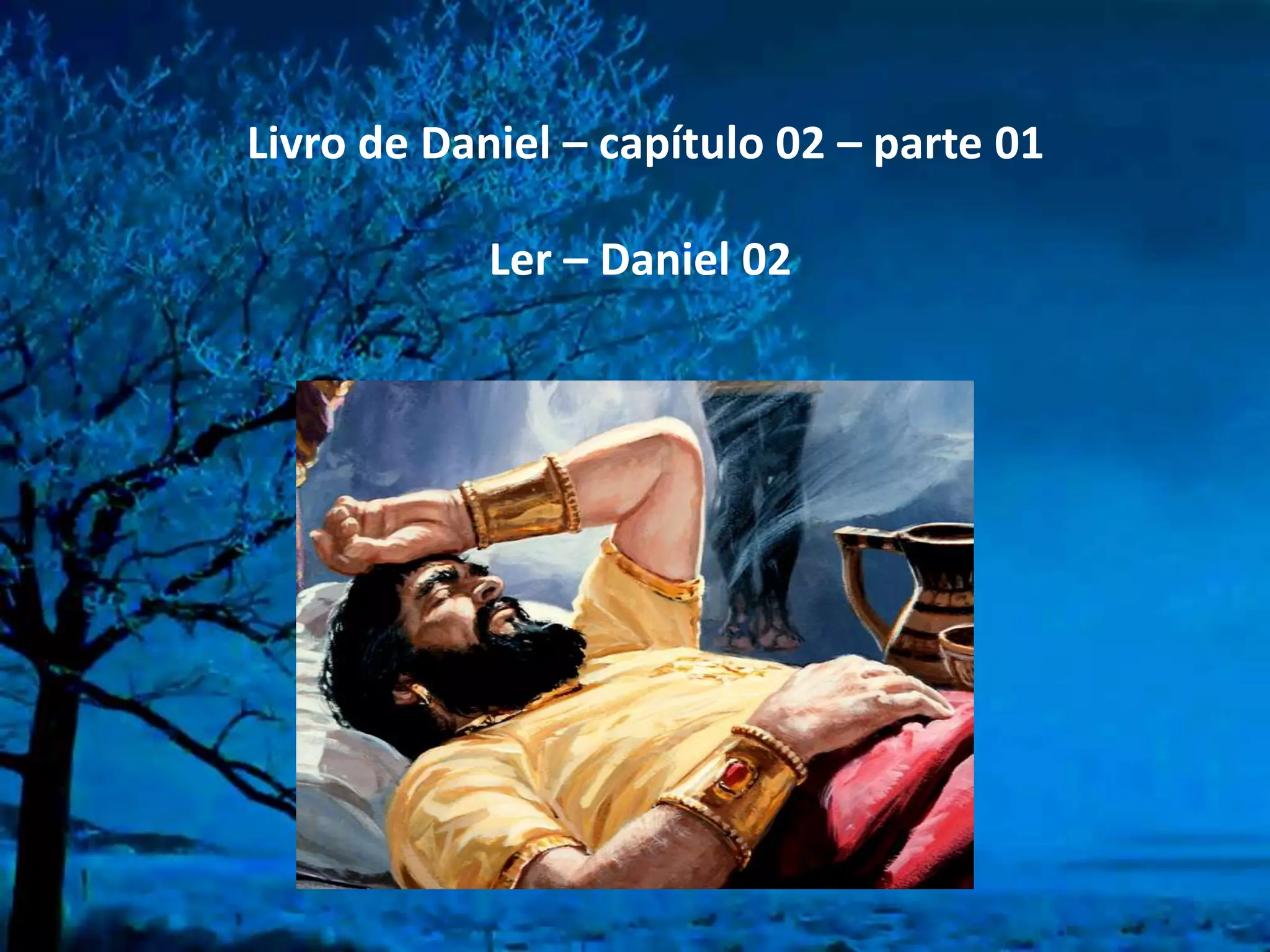O documento resume o capítulo 2 do Livro de Daniel. Ele descreve que (1) o rei Nabucodonosor teve um sonho assustador e pediu aos sábios que o interpretassem, porém eles não puderam. (2) Daniel recebeu uma revelação de Deus sobre o sonho e sua interpretação. (3) Daniel explicou que o sonho representava quatro grandes impérios que seriam destruídos pelo reino eterno de Deus.