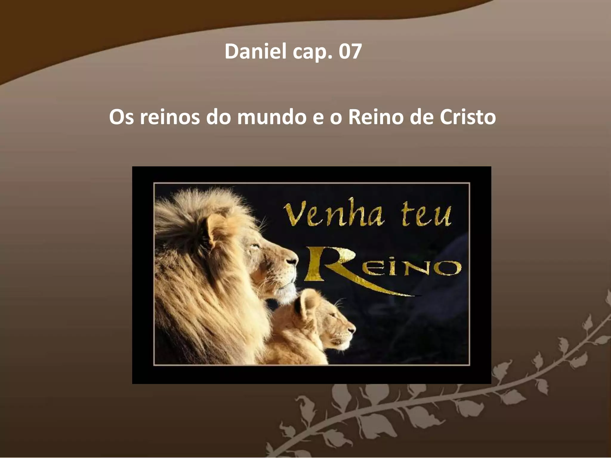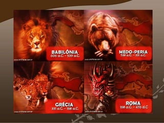 1) Daniel profetiza sobre quatro grandes impérios mundiais (Babilônia, Medo-Persa, Grécia e Roma) e sobre o surgimento de um poderoso e maléfico líder no fim dos tempos conhecido como Anticristo.