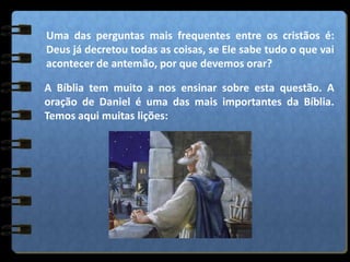 1) O documento discute a oração de Daniel no capítulo 9 e como ela fornece lições sobre orar, apesar de Deus já ter decretado o futuro.
