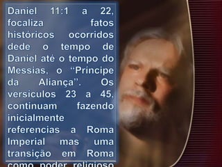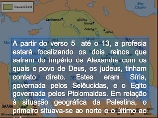 Três reis se levantariam no reino Persa seguidos por um quarto, Xerxes, que acumularia grandes riquezas e suscitaria todos contra a Grécia. Alexandre, o Grande conquistaria todo o mundo conhecido, mas seu reino seria dividido entre quatro de seus generais após sua morte. Uma sucessão de guerras entre os reinos do norte e do sul se seguiriam, com os reis do Egito e da Síria constantemente em conflito pela Palestina.