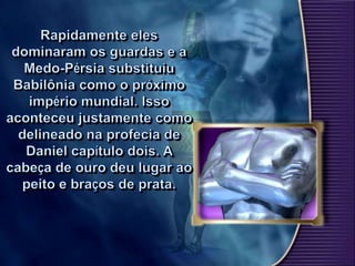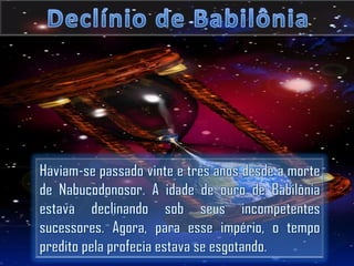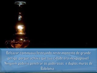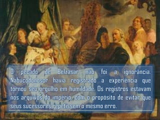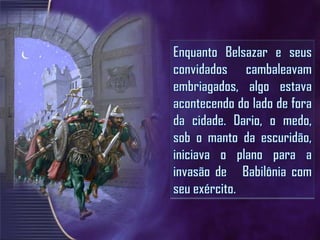 Belsazar deu um grande banquete onde mandou trazer os vasos sagrados roubados de Jerusalém para que ele, seus príncipes e concubinas bebessem neles. De repente, apareceu uma mão misteriosa escrevendo na parede. Quando nenhum sábio pôde interpretar, Daniel foi chamado e lembrou a Belsazar que Deus havia dado o reino a seu avô Nabucodonosor, mas ele se orgulhou e foi punido. Daniel então interpretou a escrita como a queda iminente de