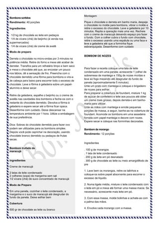 O documento fornece receitas para diversos tipos de doces, incluindo bombons, trufas e brigadeiros. As receitas variam de bombons recheados com creme de maracujá a trufas de chocolate com laranja. Fornece instruções detalhadas sobre ingredientes e modo de preparo para cada doce listado.