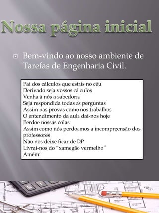 O documento apresenta uma oração para pedir sabedoria e entendimento para as tarefas e provas de engenharia civil, seguido de um exercício simples de AutoCAD e a lista de tarefas para os próximos dias de outubro e início de novembro.