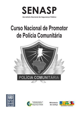 Este documento apresenta o curso nacional de promotor de polícia comunitária desenvolvido pela Secretaria Nacional de Segurança Pública (SENASP). O curso foi elaborado por um grupo de trabalho composto por policiais de todo o país e tem como objetivo capacitar operadores de segurança pública sobre a filosofia e práticas da polícia comunitária. O curso é dividido em vários módulos que abordam temas como direitos humanos, mediação de conflitos e mobilização social.