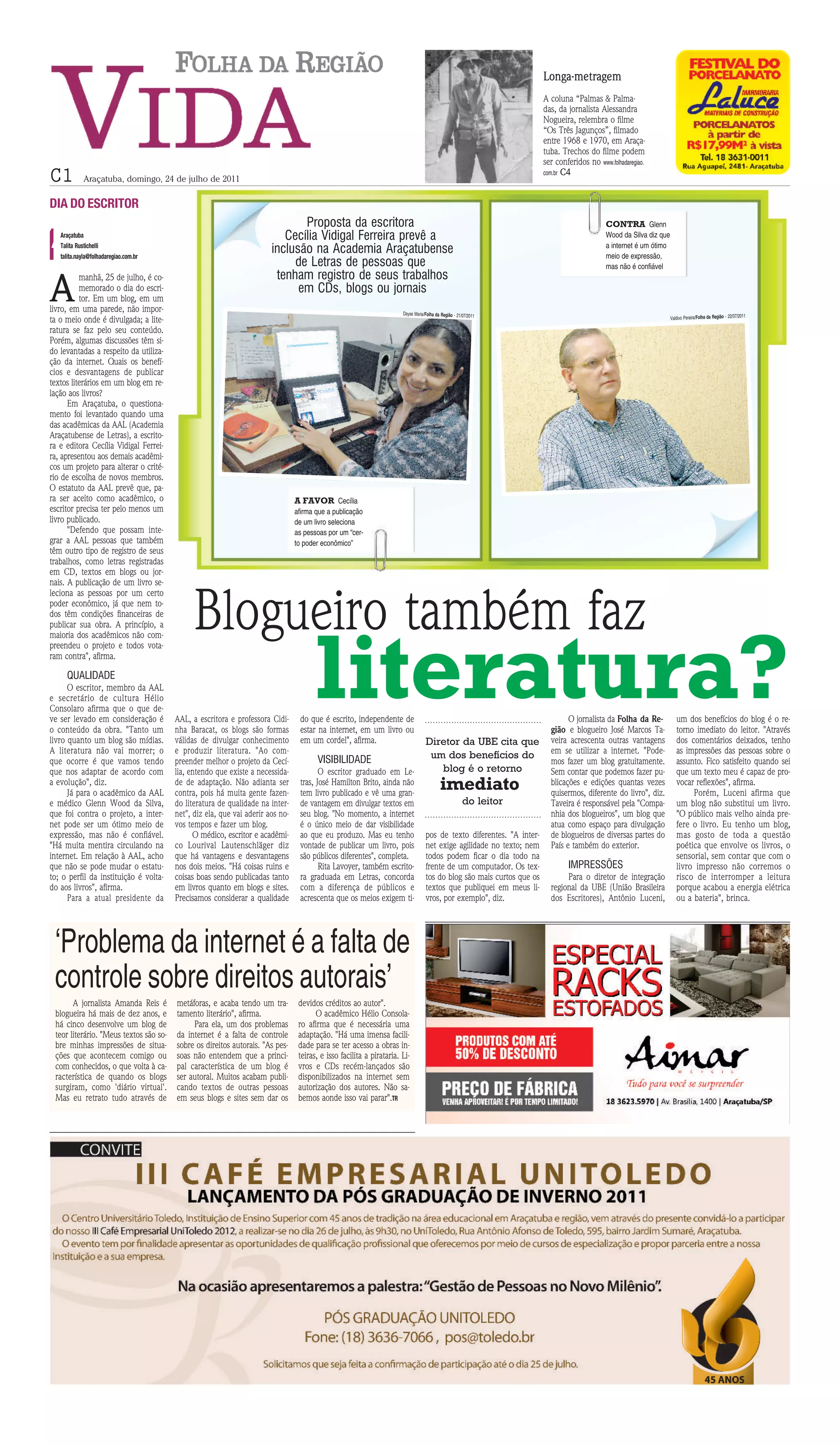 O documento discute os benefícios e desvantagens da publicação de textos literários em blogs versus livros impressos. Uma acadêmica da Academia Araçatubense de Letras propõe incluir pessoas que publicam em blogs e outros meios digitais. Alguns apoiam a proposta devido à democratização proporcionada pela internet, enquanto outros têm ressalvas sobre a confiabilidade e direitos autorais na rede.
