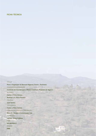 Este documento apresenta um resumo de um livro sobre a flora e vegetação do Barrocal Algarvio em Portugal. O livro descreve a diversidade de plantas na área, analisa as comunidades vegetais e suas ecologias, e mapeia a vegetação potencial assim como habitats importantes. Ele fornece informações detalhadas sobre a flora local, comunidades vegetais e recomendações para a conservação da biodiversidade na região do Barrocal Algarvio.