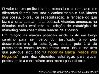 A construção de uma marca pessoal de sucesso é vital para a valorização profissional, envolvendo conhecimento, habilidades e a força da marca. O autor apresenta dez estratégias para desenvolver essa marca, enfatizando a importância das redes sociais na promoção profissional e na criação de uma rede de referências. Apesar dos desafios, investir na marca pessoal é crucial para obter reconhecimento e recomendações no mercado de trabalho.