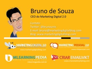 Bruno é o CEO da Marketing Digital 2.0 e oferece serviços de marketing digital, incluindo um blog e livros sobre o assunto. Seu livro "Marketing Digital 2.0: Como sair na frente da concorrência" está disponível em versão impressa completa e em e-book gratuito parcial online.
