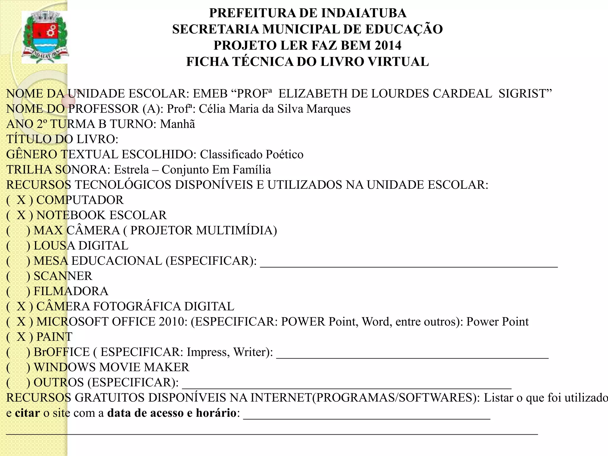 Este documento descreve um projeto literário realizado por uma escola em Indaiatuba. Ele fornece detalhes sobre o livro virtual criado por alunos do 2o ano sob a orientação da professora Célia Silva, incluindo o gênero textual escolhido (poesia classificada), os recursos tecnológicos utilizados e as etapas do processo de criação.