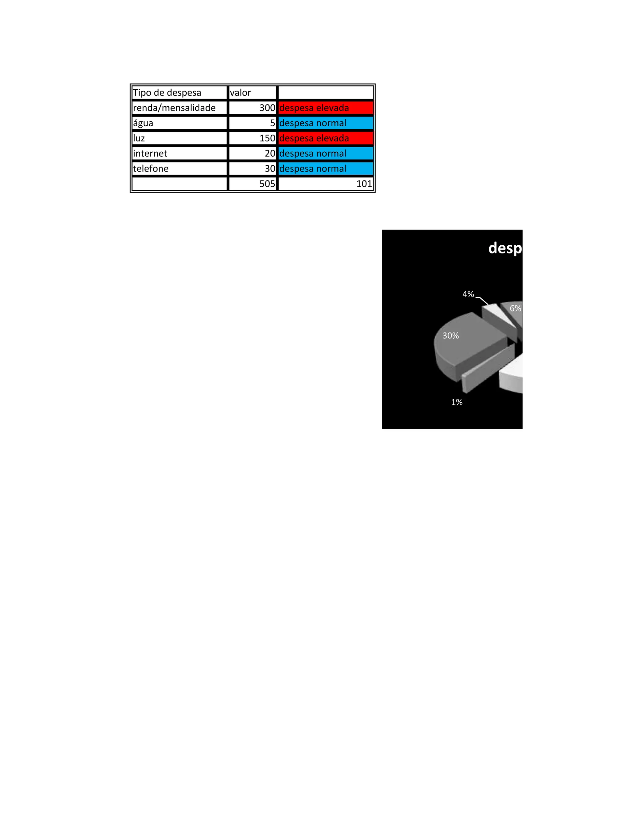O documento lista as despesas mensais de Ruben Couto, totalizando R$505. Sua maior despesa é com renda/mensalidade, representando 30% do total, seguida por luz com 59%. Água, internet e telefone são consideradas despesas normais em comparação com renda/mensalidade e luz, que são elevadas.