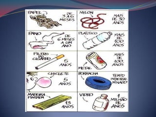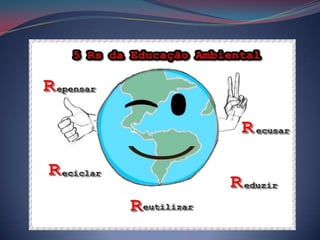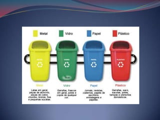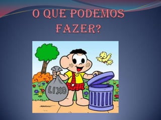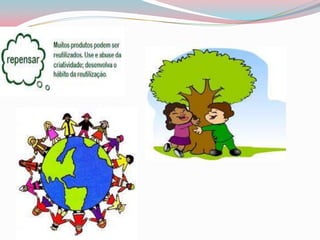 O documento discute como o lixo é um problema de todos e como ele pode poluir outros lugares mesmo depois de ser coletado. Também enfatiza a importância de reduzir, recusar e repensar os hábitos de consumo para gerar menos lixo, e de reutilizar e reciclar itens para reduzir o impacto no meio ambiente.