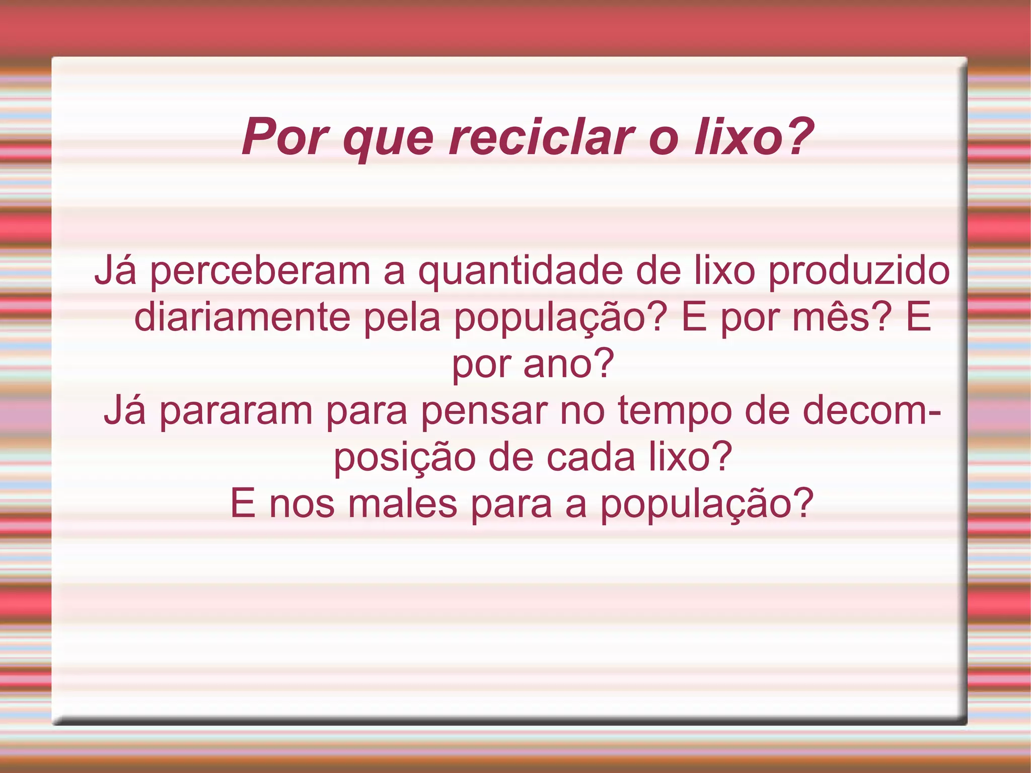 Este documento discute os benefícios da reciclagem para reduzir a quantidade de lixo produzido diariamente e os impactos ambientais negativos do lixo. Ele explica que um ser humano produz em média 5kg de lixo por dia e que a reciclagem de vidro, alumínio, plástico e papel pode economizar significativamente energia e recursos naturais em comparação com a produção de novos materiais a partir de fontes primárias.