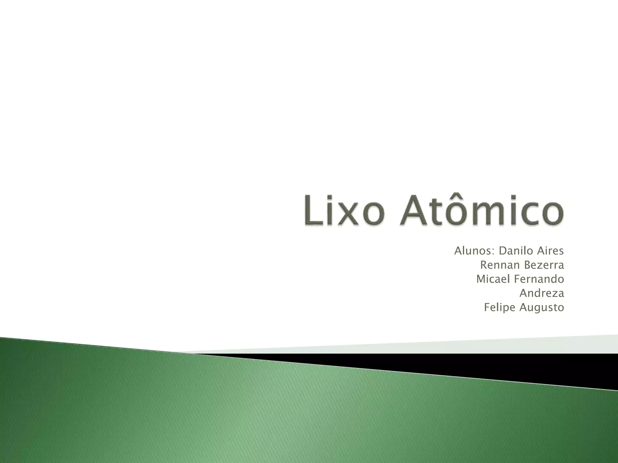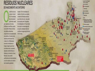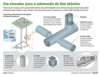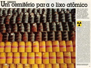 O documento discute os resíduos radioativos gerados por usinas nucleares, conhecidos como "lixo atômico". Explica que existem três categorias de lixo atômico classificadas pelo nível de radiação: alto, intermediário e baixo. Também destaca os riscos à saúde e meio ambiente quando esses resíduos são tratados ou armazenados indevidamente.