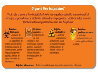O lixo hospitalar, que inclui resíduos como agulhas e sangue, apresenta riscos significativos de contaminação se não for descartado corretamente, conforme orientações da ANVISA. É crucial que esse lixo seja classificado, embalado e tratado de acordo com a norma 307, de 2004, para evitar doenças. Além disso, alguns materiais na área da saúde podem ser reciclados, contribuindo para a proteção ambiental.